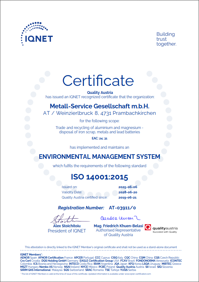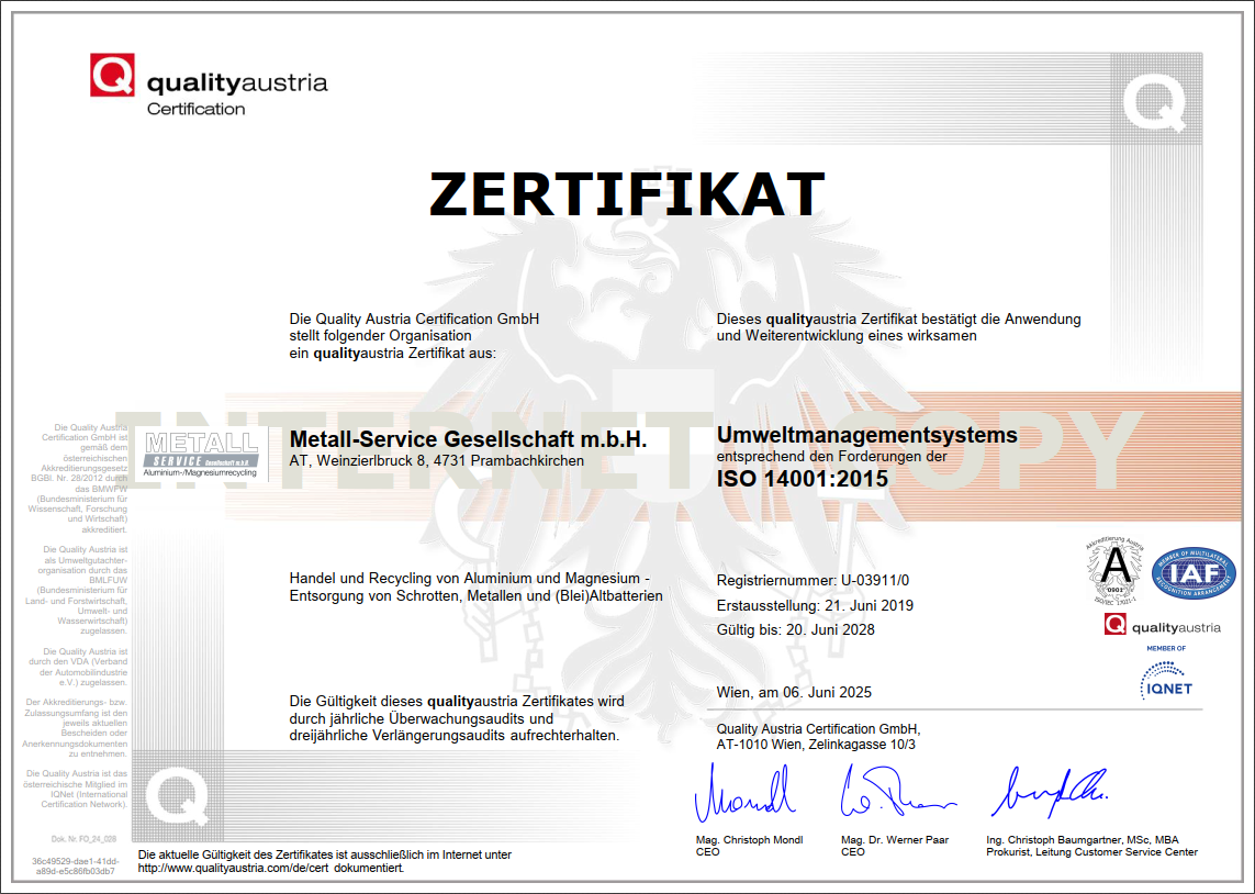 Wir sind gemäß ISO 14001:2015 zertifiziert. Nachstehend finden Sie unsere Zertifikate.